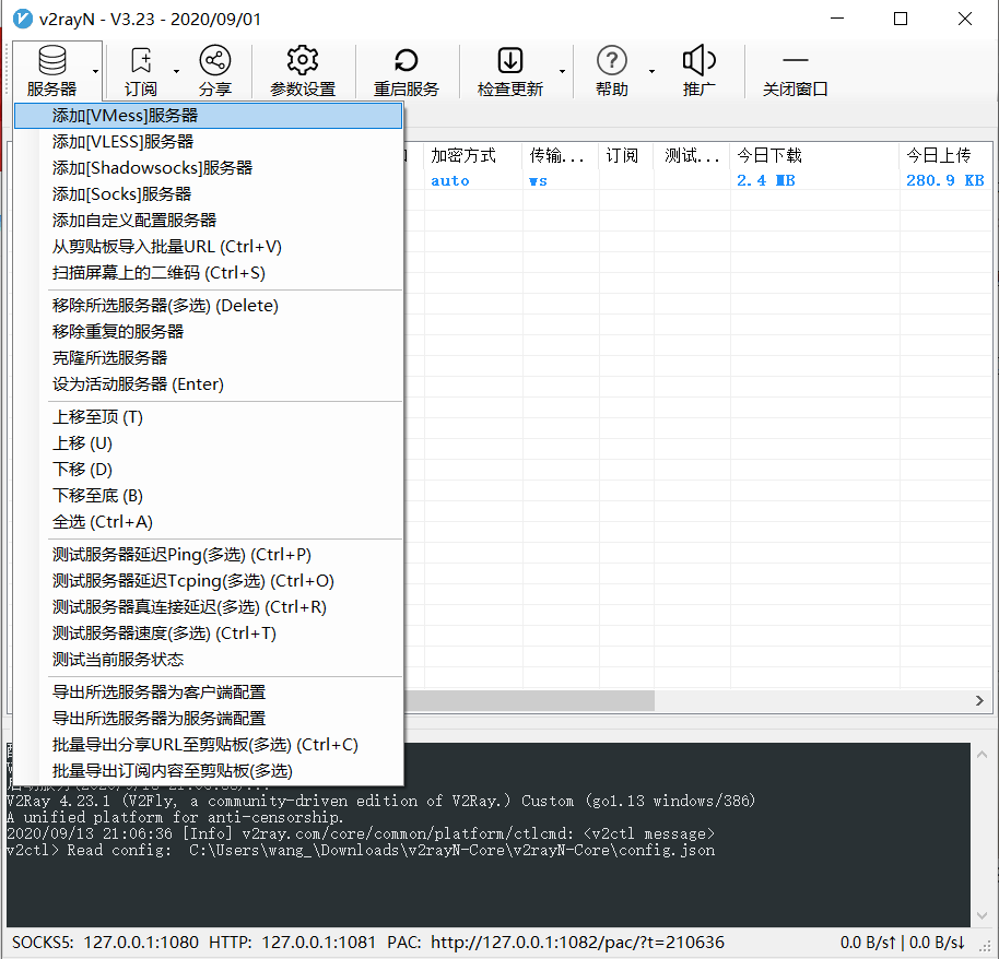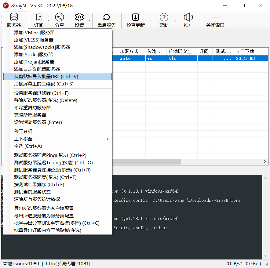 复制VMess URL地址,点击服务器菜单 -> 从剪切板导入批量URL