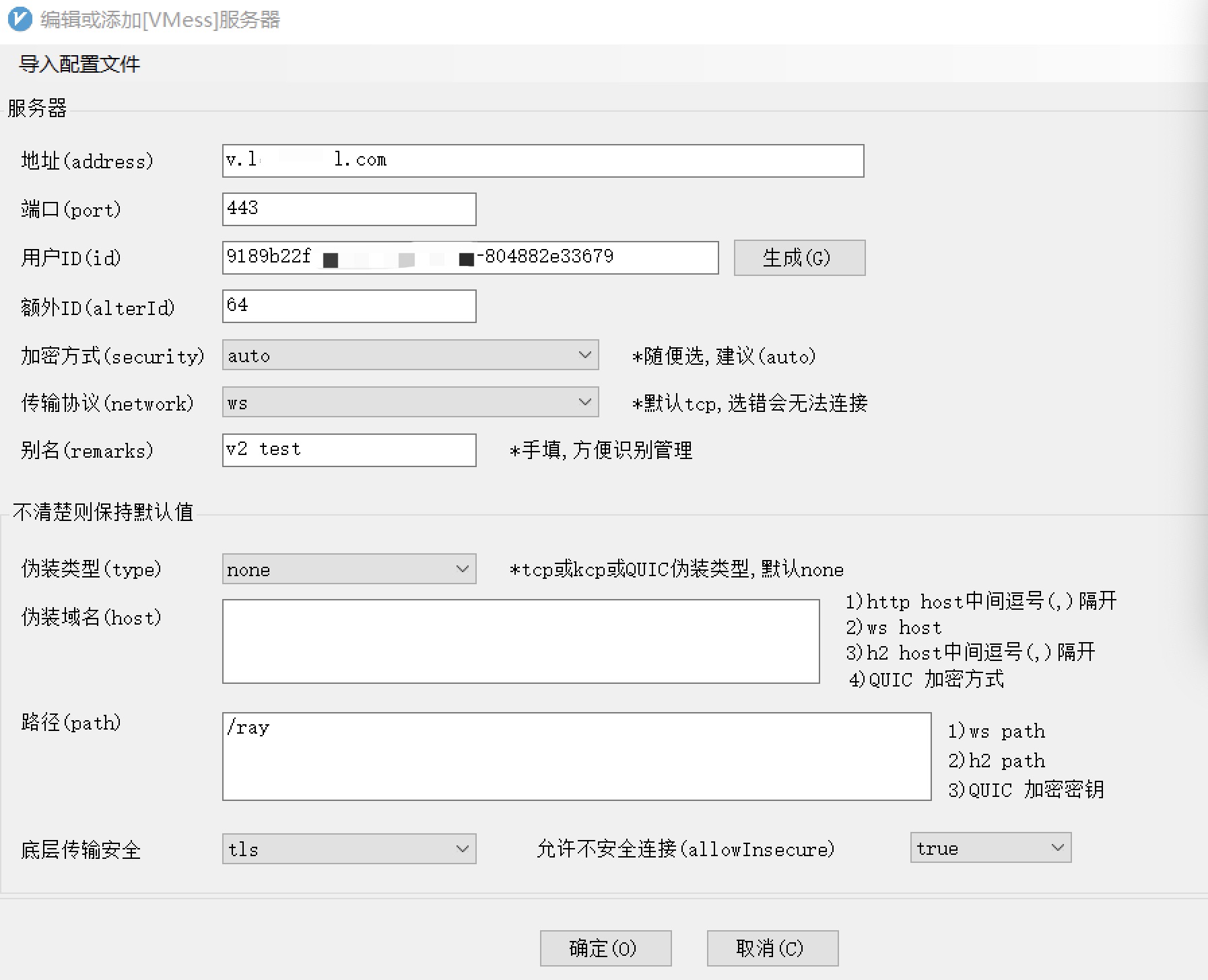 这里服务器配置基本跟下面截图基本一致;域名和用户id需要修改为v2ray服务端支持的用户ID和域名。