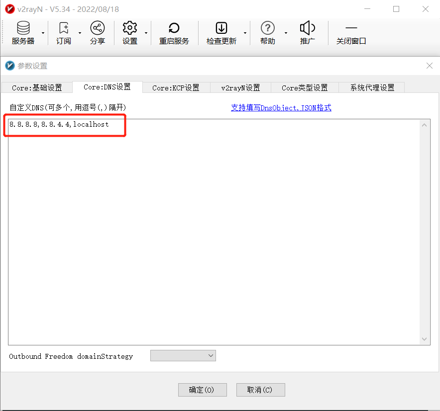 点击设置菜单 -> Core: DNS设置;其中自定义DNS可调整为 (可以复制粘贴下面这个配置过去)