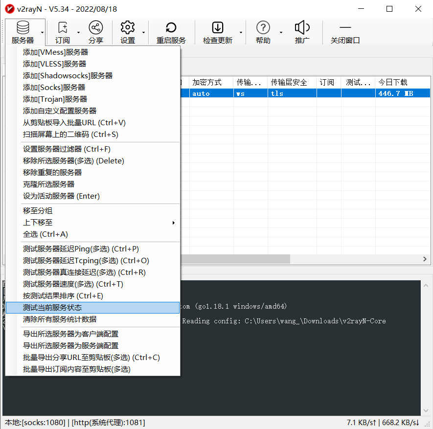 点击服务器->选择测试当前服务器状态 来检测服务器能否连接上。